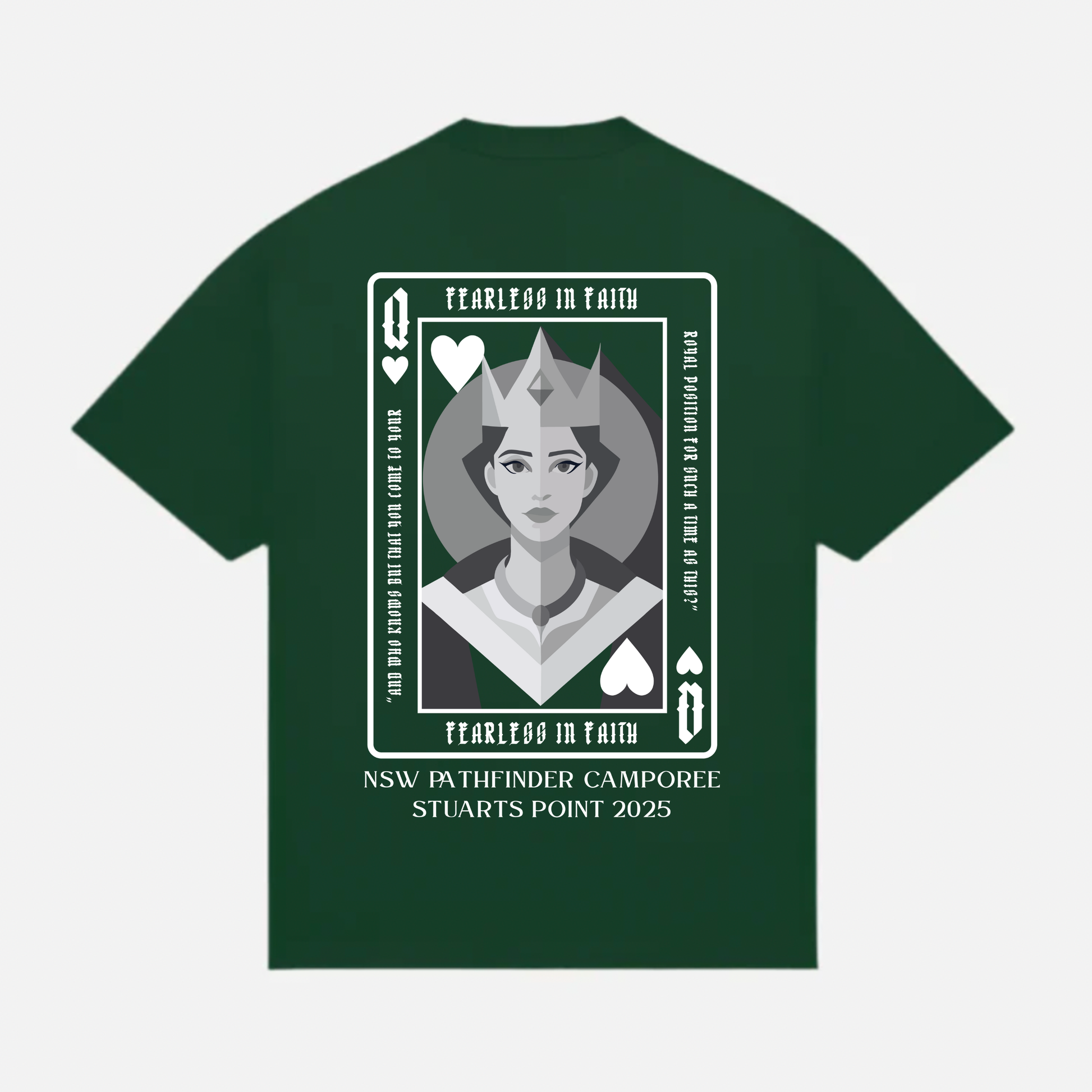 The Print design was originally created for the NSW Pathfinder Camporee Drama Team, this design celebrates choosing faith over fear and stepping boldly into your calling. Each Tee is made to order, making every piece as intentional as the message it carries.